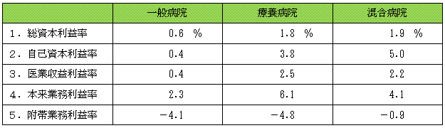 ・総資本利益率 ・自己資本利益率 ・医業収益利益率 ・本来業務利益率 ・附帯業務利益率