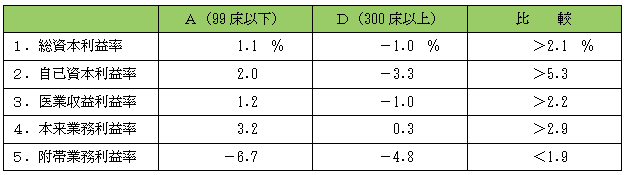 そこで、一般病院のうち病床数の少ないA(99床以下)と病床数の多いD(300床以上)を比較すると次のように示しうる。