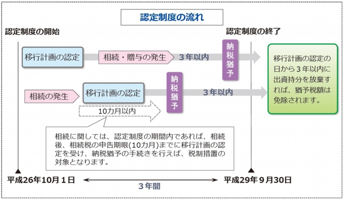 そこで、それを排除するため、厚生労働省の認定を受けた日から最長3年以内は、納税猶予・免除ができるように制度化されました。 移行計画の認定制度が実施(申請期間)されるのは、平成26年10月1日から平成29年9月30日の間の3年間となります。