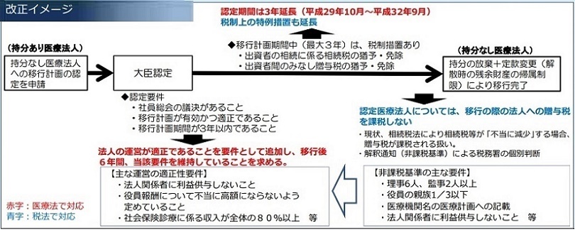 定款に持分の定めのある医療法人が、持分の定めのない医療法人へ移行することを促進するため、平成 26 年 10 月 1 日より平成 29 年 9 月 30 日まで、移行計画の認定制度を設け、相続税猶予等の優遇措置が行われてきました。 平成 29 年 4 月 1 日に公布された「所得税法等の一部を改正する法律(平成 29 年法律 第 4 号)」により「租税特別措置法(昭和 32 年法律第 26 号)」の一部が改正されるとともに、平成 29 年 6 月 14 日に公布された「医療法等の一部を改正する法律(平成 29 年法 律第 57 号)」により「良質な医療を提供する体制の確立を図るための医療法等の一部を 改正する法律(平成 18 年法律第 84 号)」の一部が改正され、認定期限が 3 年間延長されるとともに認定要件等が見直されました。